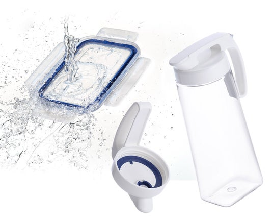 キャンペーン賞品の二つ目「シームレスピッチャー」は、パッキンとふたが一体化しており部品が少なく洗いやすい事が特長。パッキンとふたは段差が少なく密着しており、茶渋などが溜まりにくい設計です。また、立ててドアポケットにすっぽりと収まるのはもちろん、横に倒して置いても漏れません。ドアポケットは牛乳や調味料などでいっぱいになっているご家庭が多く、ピッチャーを入れる隙間がない事がよくあります。そこで、「冷蔵庫内収納問題」と「毎日のお手入れ問題」をダブルで解決したのが「シームレスピッチャー」です。