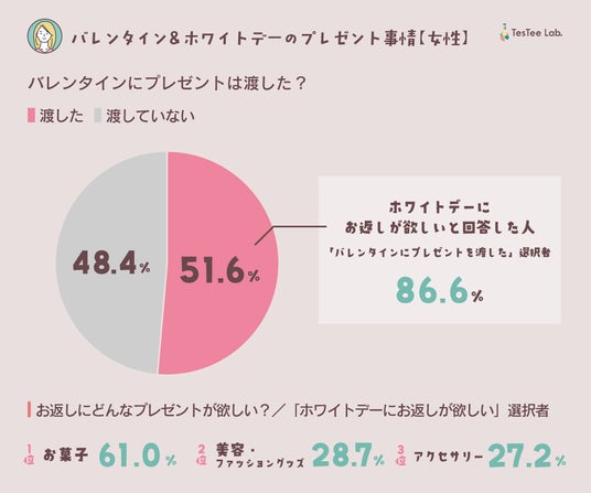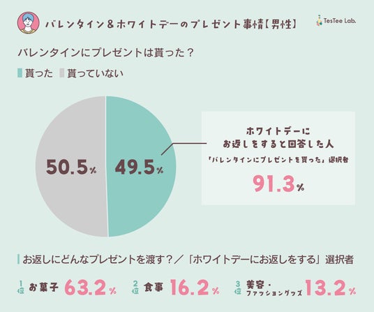 リサーチ事業・プロモーション事業・マーケティング事業を展開する株式会社テスティー(本社:東京都渋谷区、代表取締役:服部峻介)は、若年層リサーチ結果を発信する「TesTee Lab」にて、社会人の男女605名(男性301名、女性304名)を対象に「バレンタインデーとホワイトデー」に関する調査を実施しました。