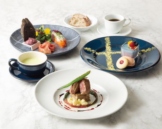○内容:前菜盛り合わせ、そら豆のスープ、仔牛のポワレと茄子のプレッセ、ブルーベリーのムースとバタフライピーの青いムース リンゴンベリーアイス、コーヒー又は紅茶