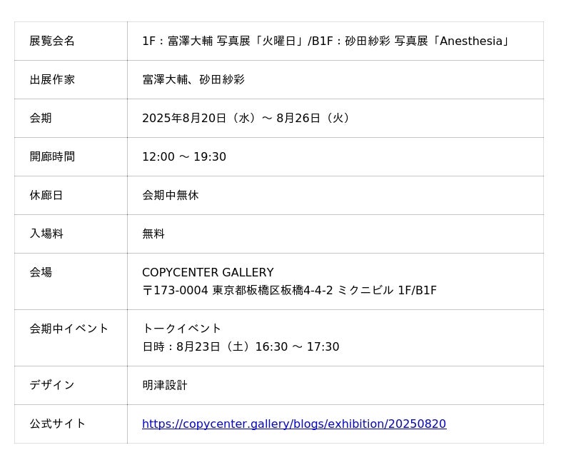 この度、アートギャラリー「COPYCENTER GALLERY」は、2025年8月20日(水)から8月26日(火)まで、1Fにて富澤大輔による写真展「火曜日」、B1Fにて砂田紗彩による写真展「Anesthesia」を同時開催いたします。
