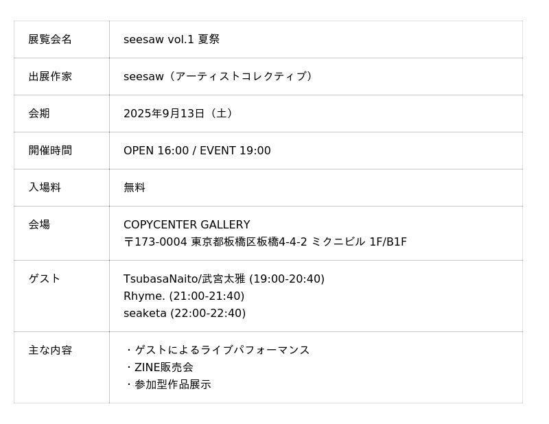 この度、アートギャラリー「COPYCENTER GALLERY」は、2025年9月13日(土)に、アーティストコレクティブ「seesaw」による一夜限りのイベント「seesaw vol.1 夏祭」を開催いたします。