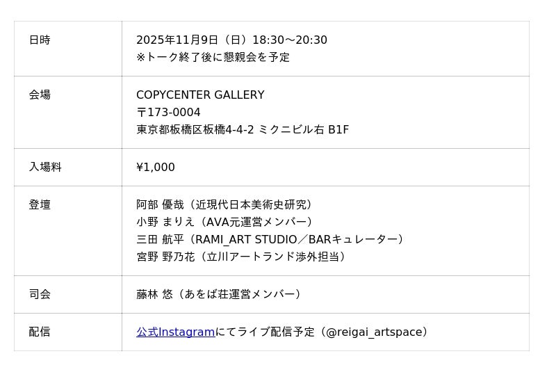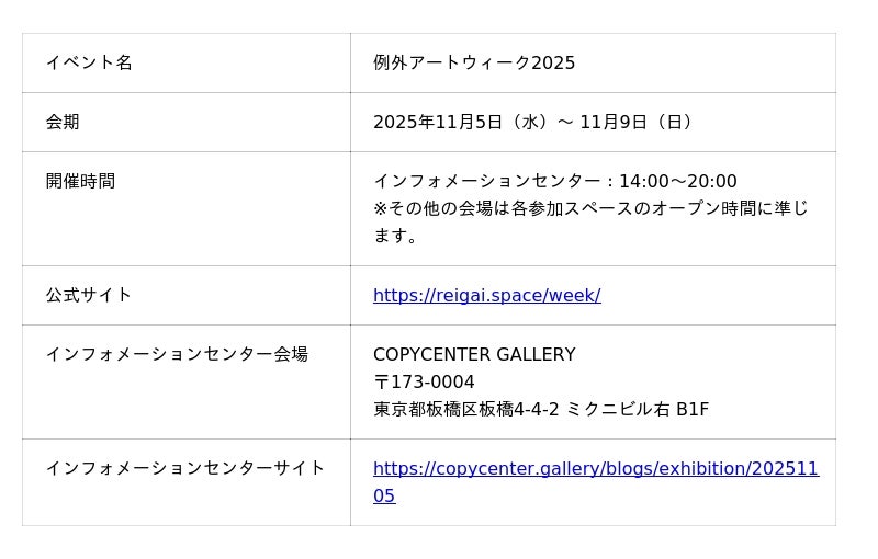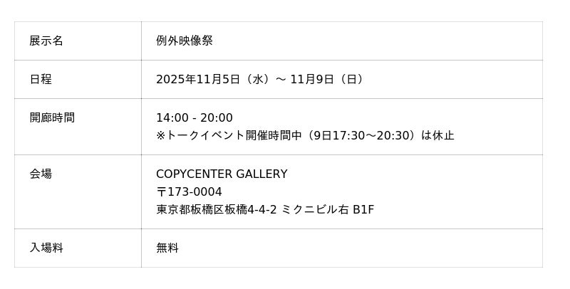 2025年11月5日(水)から11月9日(日)までの5日間、東京近郊のオルタナティブスペースが集結するイベント「例外アートウィーク2025」が開催されます。アートギャラリー「COPYCENTER GALLERY」(東京・板橋)は、本イベントのオフィシャルインフォメーションセンターとして、期間中に各スペースの情報を掲示するほか、映像祭やトークイベントなどの特別企画を実施します。