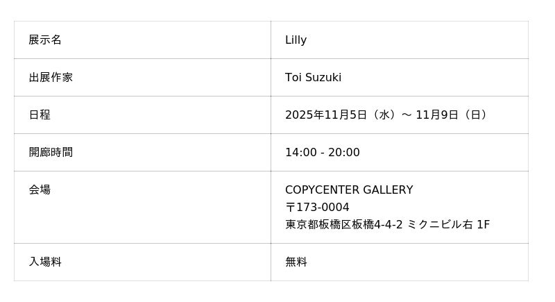 COPYCENTER GALLERY1FではToi Suzuki個展「Lilly」を同時開催いたします。