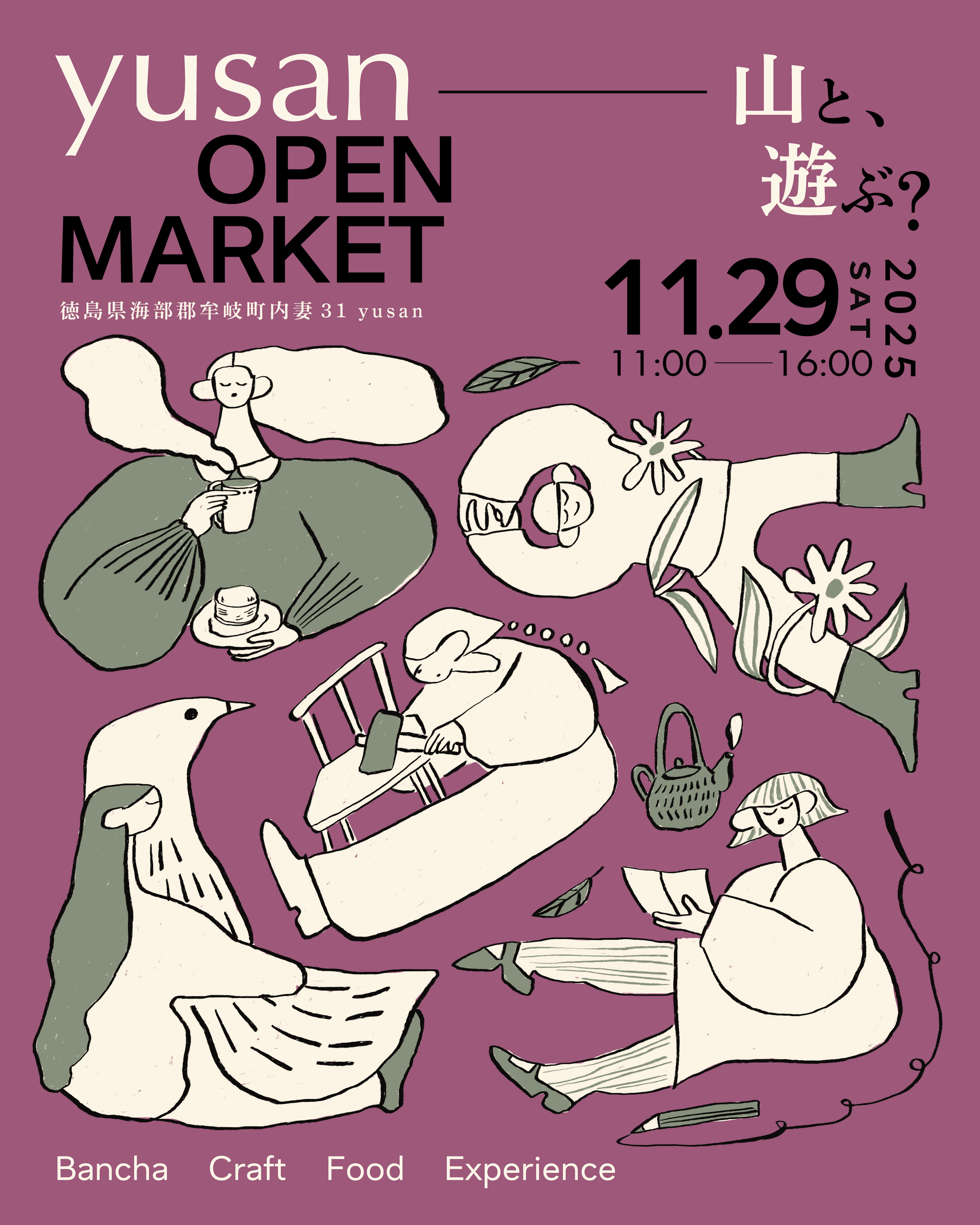 合同会社門口(徳島県牟岐町・代表 田中美有)は、使われなくなった人工林で、感性・創造性を起点に、人・文化・自然の関係をもう一度動かすカルチャーブランド「yusan(ユサン)」を11月29日に正式リリースします。日常の行為を山にひらく「遊山文化」という山との関わり方を現代に広げることを目指しています。同日、「山と、遊ぶ?」をテーマにした体験イベント「yusan open market」を開催。県内外13の出店者によるフード・クラフトや、番茶の飲み比べ、茶会などをお楽しみいただけます。