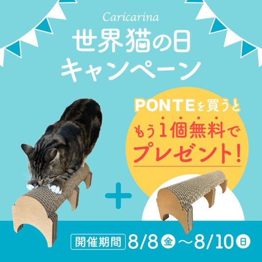 猫の爪とぎ専門店「カリカリーナ公式オンラインショップ」(本社:千葉県館山市神余、代表取締役:佐藤尚起)では、2025年8月8日の「世界猫の日(International Cat Day)」を記念して、人気の爪とぎ「PONTE(ポンテ)」を購入された方に、同じ商品をもう1個プレゼントするキャンペーンを開催します。