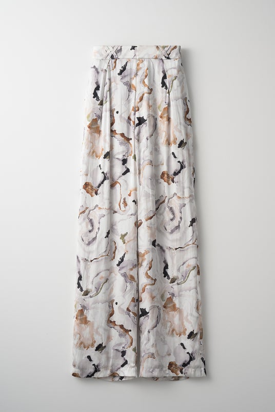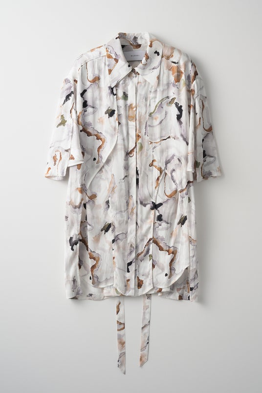 コレクションの着想源となった植物図鑑から、マツムシソウ科の植物「Dipsacus」をセレクトし、デザイナー関口がアルコールインクの手法を用いて手描きで表現したグラフィックアイテムです。MURRALならではの個性的なカラーリングと繊細なタッチが特徴で、インクの広がりやぼかしが生み出す自然な模様が、植物のようで植物でないエレガントさと奇妙さを併せ持つ美しさをデザインに反映しています。