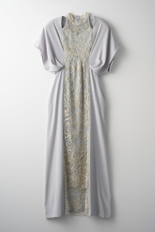 蕾を思わせるケープショルダーのカッティングと、縦のラインを強調するレースの切り替えが特徴です。ポケット付きで実用性も備え、裏地付きのため透け感を気にせず快適に着用可能です。