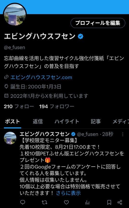 株式会社Ebbinghaus Stationery(所在地:兵庫県神戸市)は、Xアカウントで「エビングハウスフセン」を試してみたい学校10校に1校あたり付箋10個(合計付箋100個)をプレゼントすることをお知らせします。