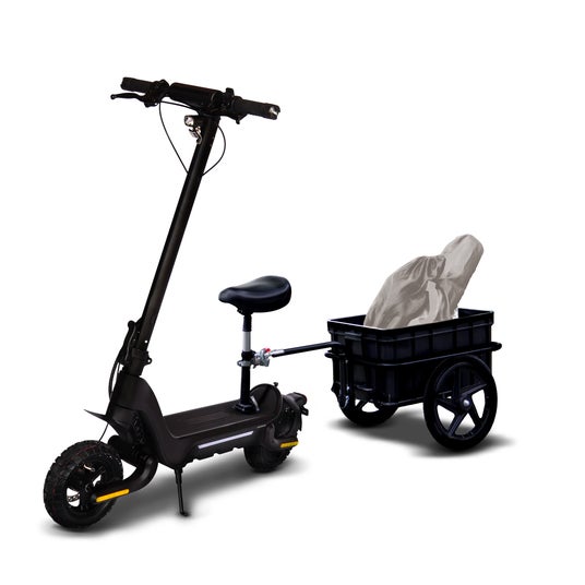 【MOBILITYより】オフロードを走れる電動キックボードMTM RiSE M-1S。オプションのサドル&キャリーカーで荷物も容易に運べます。