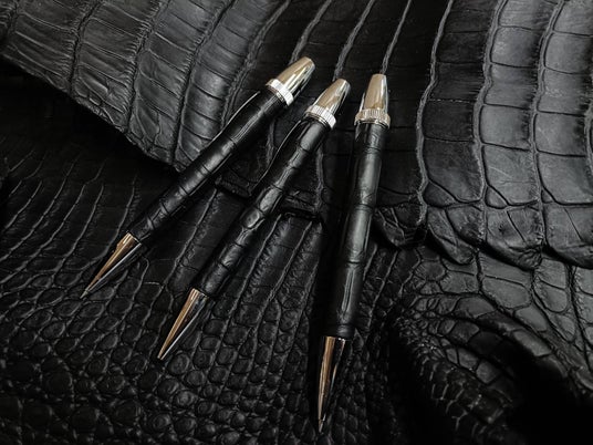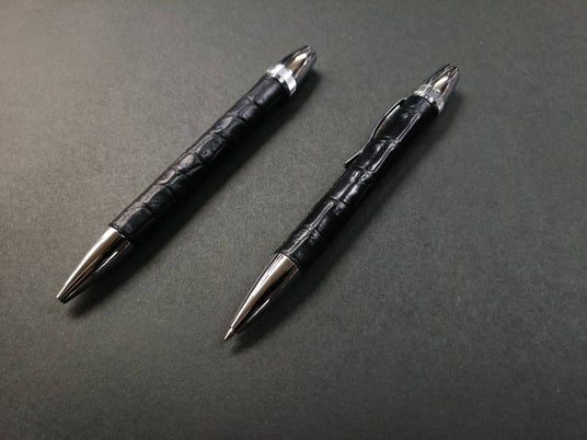 「漆黒の極致」は、デジタル化が進む現代においても「書く」という行為の価値を最上級の体験へと高める高級筆記具です。大正4年創業の株式会社京都紋付様に依頼し、革の王者と呼ばれるクロコダイルレザーを究極の黒色に染め上げました。クロコダイルレザー特有の鱗模様と、黒染めによる独特の深みが融合した工芸品的価値を持ち、ビジネスシーンでの品格を高め、大切な方への特別なギフトとして記憶に残る逸品です。