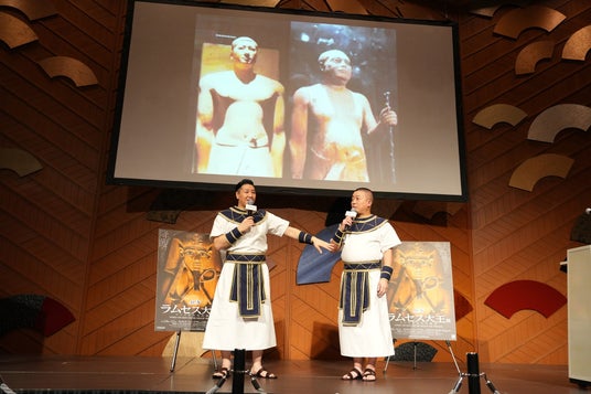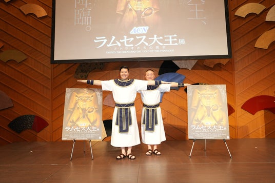 開催に先立ち行われた記者発表会では、エジプトの博物館に展示されている彫像がそっくりだと大きな反響を巻き起こしたチョコレートプラネットの長田庄平さん、松尾駿さんが登壇。話題になった彫像をモチーフにした衣装に身を包み、登場しました。似ていると話題になった古代エジプト人の彫像がスクリーンに映し出されると、長田さんは「顔も結構似ているんですが、体形もそっくりなんですよね。肩幅と中肉中背の感じとか。」、松尾さんは「お腹の肉の付き方がそっくりなんですよね~。自分の裸を見比べると本当に似ています。」とお話されました。長田さんに似ている彫像は大祭司・ラネフェル、松尾さんに似ている彫像は祭司・カアペルであると説明されると、長田さんは「僕の方が上司なんですね!実際の僕らの関係性にも似ているかもしれません。」、松尾さんは「ラネフェル、カアペルいいですね。芸名にしようかな。」と笑顔でコメントされました。