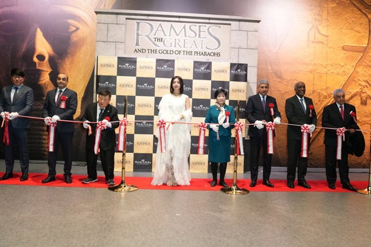 開幕に先立ち会場では、オープニングセレモニーが行われました。エジプト観光・考古大臣のシェリフ・ファティ氏などのエジプト政府関係者、元考古最高評議会事務総長・元考古担当国務大臣であり、本展覧会グローバル・キュレーターのザヒ・ハワス氏、日本におけるエジプト考古学の第一人者であり、本展覧会のジャパン・キュレーター吉村作治氏、東京都知事・小池百合子氏にご登壇いただきました。さらにスペシャルゲストとして俳優の池田エライザさんが登場。エジプトらしい装いで、本展の開幕を彩りました。
