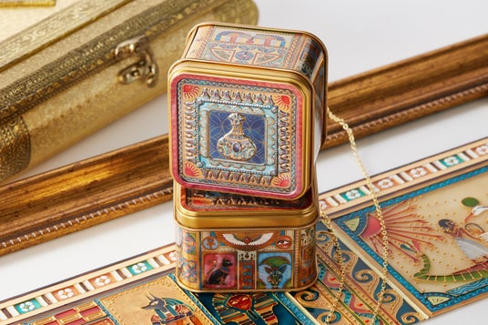エジプトのデザインモチーフからインスパイアされ、荘厳かつ繊細に描かれたオリジナルのグラスペイントは、神秘的な魅力で溢れています。その美しいデザインを、エンボス加工を施したクッキー缶の5面に転写しました。クッキー缶のデザインはグラスペイントアーティスト Alisa Horitaさんです。中のお菓子は、グルテンフリーかつ植物素材のみで作ったミルク風味のクッキーです。贅沢なデザインと共に、至福のひとときをお楽しみください。