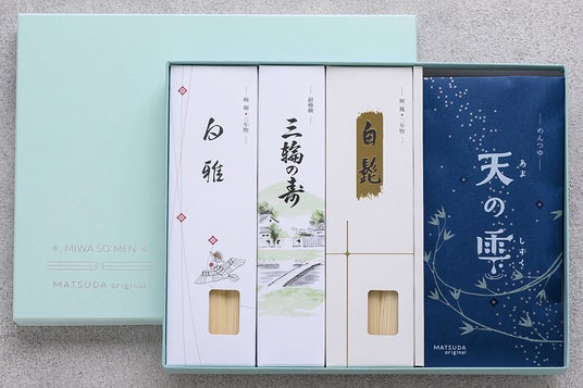 熟練の素麺師が選び抜いた最高級小麦粉を使用し、同社では三輪素麺のなかでも特に細い素麺を製造しています。今回はより高級とされている、細麺「白髭」、極細「白雅」、超極細「三輪の寿」に、オリジナルの麺つゆを特別に詰め合わせました。経験を重ねてきた職人が作る一味違うワンランク上の三輪素麺をお楽しみください。