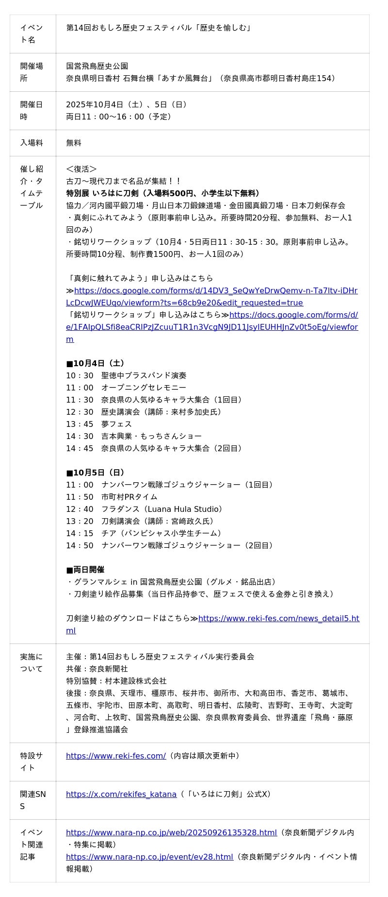 歴史フェスティバル実行委員会は、第14回おもしろ歴史フェスティバル「歴史を愉しむ」を開催します。日程は10月4日(土)・5日(日)の2日間、会場は奈良県明日香村 石舞台横「あすか風舞台」(奈良県高市郡明日香村島庄154・国営飛鳥歴史公園内)。共催は奈良新聞社(本社:奈良市法華寺町2番地4、田中篤則代表取締役社長)。