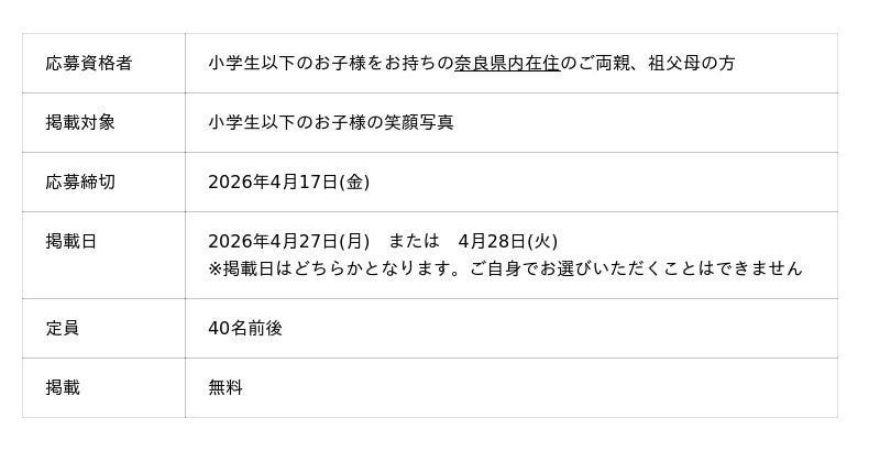 奈良新聞紙面特集(4月27日・28日掲載予定)の「子ども笑顔写真」に掲載するお子様の写真を募集します(掲載無料・掲載日は選べません)。写真はカラーで掲載いたします。