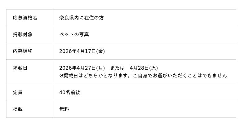 奈良新聞紙面特集(4月27日・28日掲載予定)の「我が家のペット写真」に掲載する写真を募集します(掲載無料・掲載日は選べません)。写真はカラーで掲載いたします。▼募集要項