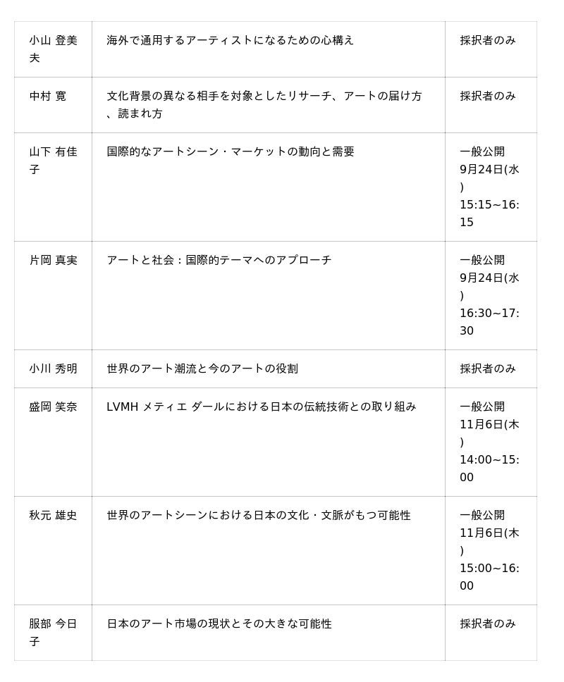 森美術館の片岡館長やLVMH メティエ ダール ジャパン ディレクターの盛岡氏等、豪華講師陣を迎え「作品性・国際性・ビジネス性」の3点を学ぶレクチャーを提供
