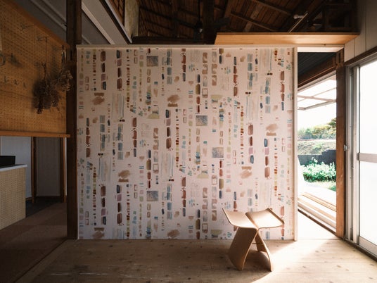 大類さんが実際にテキスタイルの柄を考える時に、水彩絵の具で描くスケッチを集めてできた壁紙です。 その瞬間の心情を映した色選び、即興的な筆の運びが美しく、そのフレッシュな思考の跡をそのままモチーフにしたいと考えました。 三崎を拠点に創作活動をされている大類さんが、三浦・三崎の生活の中で日々感じている色や光が散りばめられています。