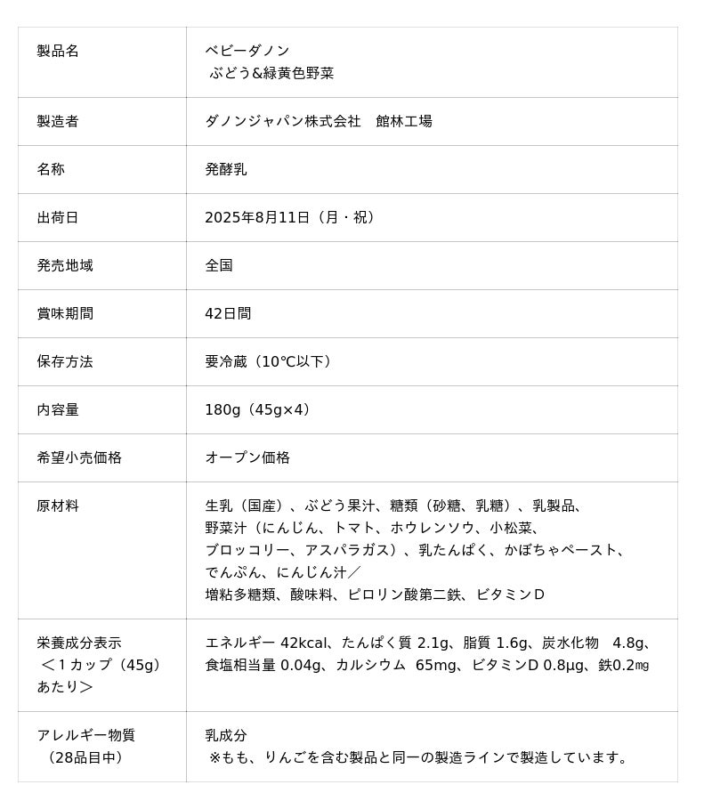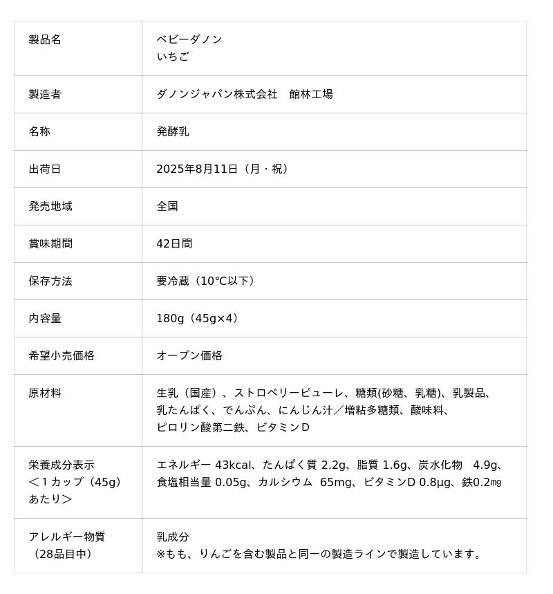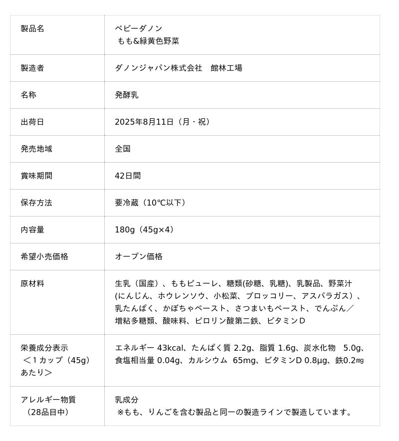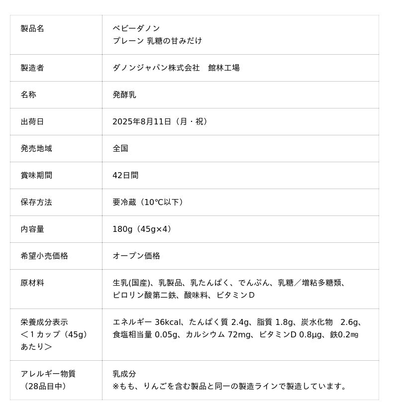 ベビーダノンは、日本において1993年に発売されて以来、30年以上にわたり、離乳期の赤ちゃんを育てるご家庭からご支持をいただいているロングセラーブランドです。生後6ヶ月頃からの離乳期の赤ちゃんの栄養バランスを考えたヨーグルトで、カルシウムをたっぷり含んでいます。また、栄養面でのサポートだけではなく、ミルク以外の味や食感、スプーンでの食事などに慣れるための食品としてもぴったりです。4種類のフレーバーをご用意しており、「プレーン・乳糖の甘みだけ」は離乳期の赤ちゃんの最初のヨーグルトにおすすめです。また、「いちご」「もも&緑黄色野菜」「ぶどう&緑黄色野菜」は野菜や果汁をピューレ状にし、異なる食感をお楽しみいただける2層仕立てです。ごはんの一品としてはもちろん、食後のデザートや間食(補助食)などにもご利用いただけます。