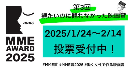 子供を育てながら働ける映像業界を目指し、業界全体の労働環境の改善に取り組む、特定非営利活動法人映画業界で働く女性を守る会(https://swfi-jp.org/ 代表:SAORI 以下swfi)では、2023年より、「観たいのに観れなかった映画賞~いやぁ、 時間がなくて~」(略称 MME賞)を開催してきました。この映画賞は、女性たちが映画館で観たいのに忙しすぎて見れなかった映画に投票するものです。3度目となる今回は、「すべての働く女性」が投票できる映画賞として開催、1月24日よりオンラインにて投票を受け付けております。