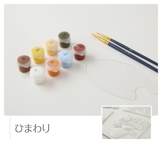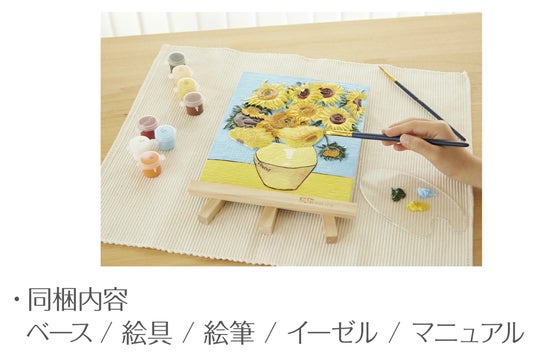 本アートキットでは、誰でもおウチで楽しめるように、ベース(作品本体)、絵の具、絵筆、パレット、固定するためのイーゼルを全てお付けします!