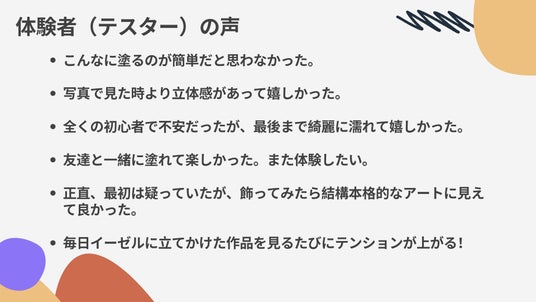 本アートキットを販売する前に事前にいくつかの美術学校や一般のアート初心者の方々にご協力をいただき、感想をいただきました。