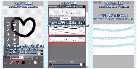 ユーザーオリジナルのブラシパターンを作成できる新機能が追加されました。これにより、既存のブラシをアレンジし好みにカスタマイズしたり、新しいブラシを作ったりすることが可能になりました。ブラシパターンを作成する専用のキャンバスで自由にパターンをデザインし保存をするだけで、作成したブラシパターンがブラシウィンドウに追加され、自作ブラシの使用はもちろん、他のユーザーと共有できるようになります。この新機能で、ユーザーの皆さまが自分だけのブラシを作成できるなど、さらに幅広い表現を可能にしました。