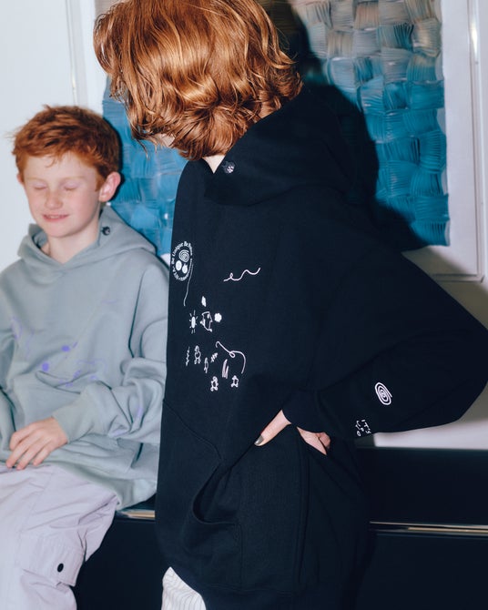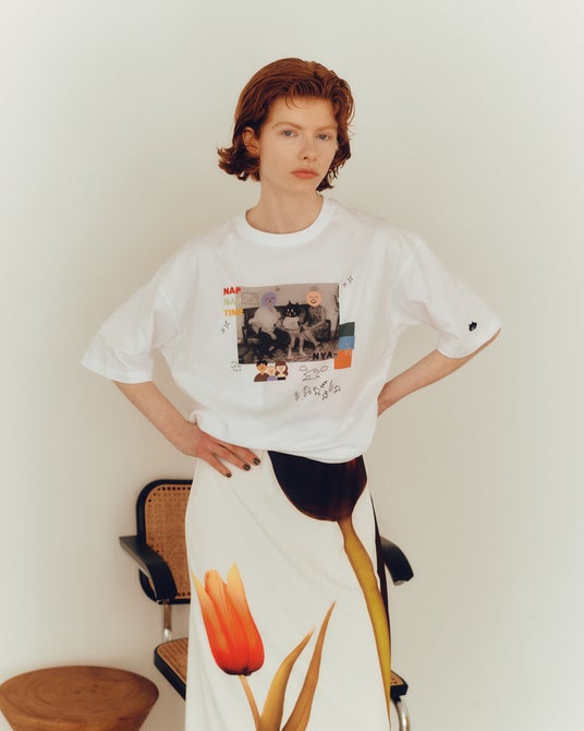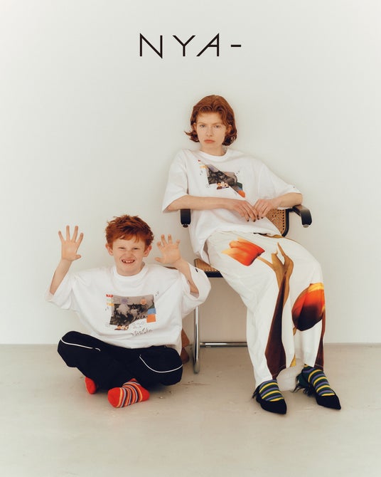 昨年、母となり家族が増えた小田原さんの今の想いを、NYA-ならではのこだわりのシルエットや素材で表現。”ファミリー”をテーマに、家族を描いたイラストをプリントしたり、ファミリーフォトをコラージュしたアートワークにプリントや刺繍を施したりしたアイテムが揃います。