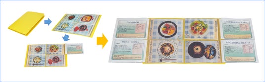 また、分割されたファイルがそれぞれ外に開くことで、例えば、主菜、副菜、主食、汁物などのファイルに入ったレシピカードを自由に何通りにも組み合わせができるので、あっという間に今夜の献立を決めることができます。スマホのデジタルの動画レシピよりも素早く献立を決められて、作る時も台所でレシピを確認しながら作れるので便利。トレーディングカードは収納だけでなく、ファイルの組み合わせが可能になるので、収納したまま対戦ゲームなどもできます。