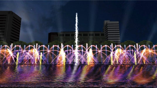 大川右岸の護岸沿いに幅約100メートルにわたる大型噴水を設置し、水と光と音が織りなす噴水ショーを実施します。都心部の河川上で展開される噴水ショーとしては国内最大級を誇り、曲に合わせて演出する水のアートは、夜になると色とりどりにライトアップされ、水と光のスペクタクルを堪能できます。対岸からも楽しんでいただけますが、クルーズ船から観覧しますと、水のしぶき、音の振動、光のゆらぎを一層体感いただけます。