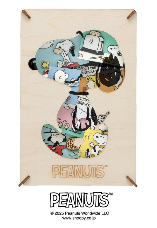 「PAPER THEATER」シリーズに、『PEANUTS』コミックスの人気キャラクターの新作が登場します。今回のデザインは、スヌーピーのシルエットをかたどったユニークなフォルム。スヌーピーの大好物であるドーナツやチョコチップ・クッキーをはじめ、食べ物をテーマにしたコミックスのシーンをモチーフに、スヌーピーやチャーリー・ブラウンなどおなじみの仲間たちがシルエットの中にぎゅっと詰め込まれています。奥行きを活かしたレイヤー構造で、裏面にもスヌーピーの後ろ姿が描かれており、前後どちらからも楽しめるデザインに仕上がっています。お部屋のインテリアとしても映えるウッドスタイルのアートは、PEANUTSファンにはたまらないアイテムです。