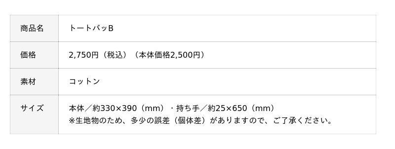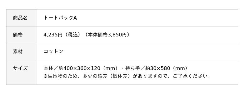 マチあり肉厚で容量は多めの「トートバックA」は、本やPC、水筒など重いものや立体的なものもいろいろ入ります。少し薄手でマチなしの「トートバックB」は、A4サイズまで入ります。そのまま使うのももちろん、小さく折りたたんでバッグに入れておけば、必要な時に取り出してエコバッグのようにも活用できます。
