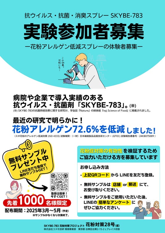 株式会社コスモ技研(所在地:東京都台東区、代表取締役社長:吉川昌孝)は、衣類や家具に付着した花粉アレルゲンを低減する可能性のあるスプレー「SKYBE-783(スカイビーナナハチサン)」の実証実験 「花粉対策28号(仮)」 を、東京都を中心とした飲食店等で実施します。