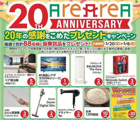 JR立川駅南口にある商業施設「アレアレア」は2025年4月8日に開業20周年を迎えます。これを記念し、これまで支えていただいたお客様への日頃の感謝を込めた「20周年記念キャンペーン」を開催いたします。