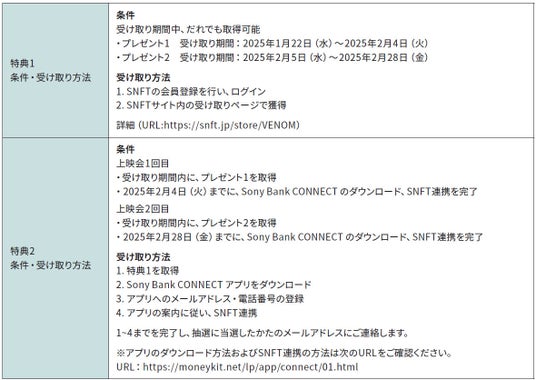 対象期間中に、デジタル配信中の「ヴェノム:ザ・ラストダンス」との3Dコラボレーションデジタルコンテンツを取得し、「Sony Bank CONNECT(TM)」のダウンロードおよびSNFT連携などの所定の条件を満たしたかたの中から抽選で各回20名さまに、『ヴェノム』&『ヴェノム:レット・ゼア・ビー・カーネイジ』リバイバル上映会にご招待します。