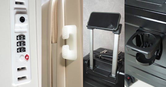 スーツケースで最も壊れやすい部分のキャスターを取り外せる仕様になり、交換も簡単にできる、取っ手にカバー付きで持ちやすい