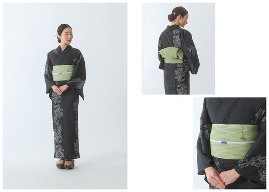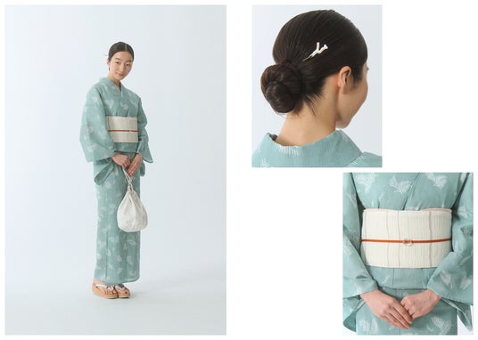 ゆかた:伊勢型紋様 萌えいづる 青磁 / 価格 52,800円 半巾帯:米沢 麻和紙 みなも 藤 / 価格 60,500円