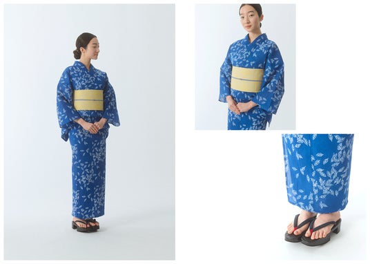 ゆかた:伊勢型紋様 青葉舞う 瑠璃 / 価格 52,800円 半巾帯:桐生 格子菱 黄 / 価格 42,900円
