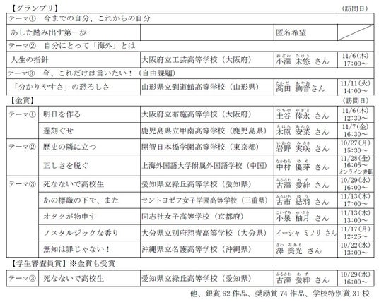グランプリ、金賞の受賞作品は以下のとおりです。なお10~11月にかけて教員(審査員)が各高校を訪問し、グランプリ、金賞受賞者へ賞状の授与と講評を行います。