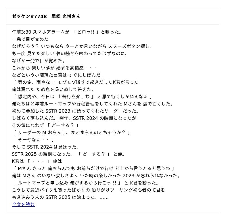 SSTR2025 AWARDの受賞者が決定しました。感動の参戦記、心に残る写真や動画など、それぞれの個性が光る物語の数々をぜひご覧ください。