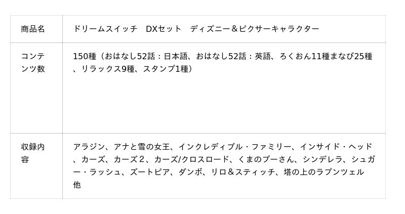 『ドリームスイッチ DXセット ディズニー&ピクサーキャラクター』は、シリーズ最多の150コンテンツを1台に収録しました。ディズニーの名作映画や物語を楽しめる「おはなし」コンテンツは日本語・英語合わせて104種を収録。「シンデレラ」「アナと雪の女王」「トイ・ストーリー」などの世界的な名作を、ゆったりとした動きとナレーションで楽しめ、寝る前のお子さまの読み聞かせにも最適です。そのほかにも、あいうえおやアルファベット、時計の読み方や言葉遊びなど、「まなび」コンテンツが37種類。また、新しい「ドリームスイッチ」シリーズの特徴の一つである、ストレッチやヒーリング音楽で心身を整える「リラックス」コンテンツも9種類収録しています。