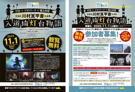 入道埼灯台利活用事業実行委員会は、2025年11月1日(土)影絵作家・川村亘平斎による「入道埼灯台物語」を開催いたします。このイベントは、日本財団「海と日本プロジェクト」の一環として、灯台を中心に地域の海の記憶を掘り起こし、地域と地域、異分野と異業種、日本と世界をつなぎ、新たな海洋体験を創造していく「海と灯台プロジェクト」の助成を受けて実施します。
