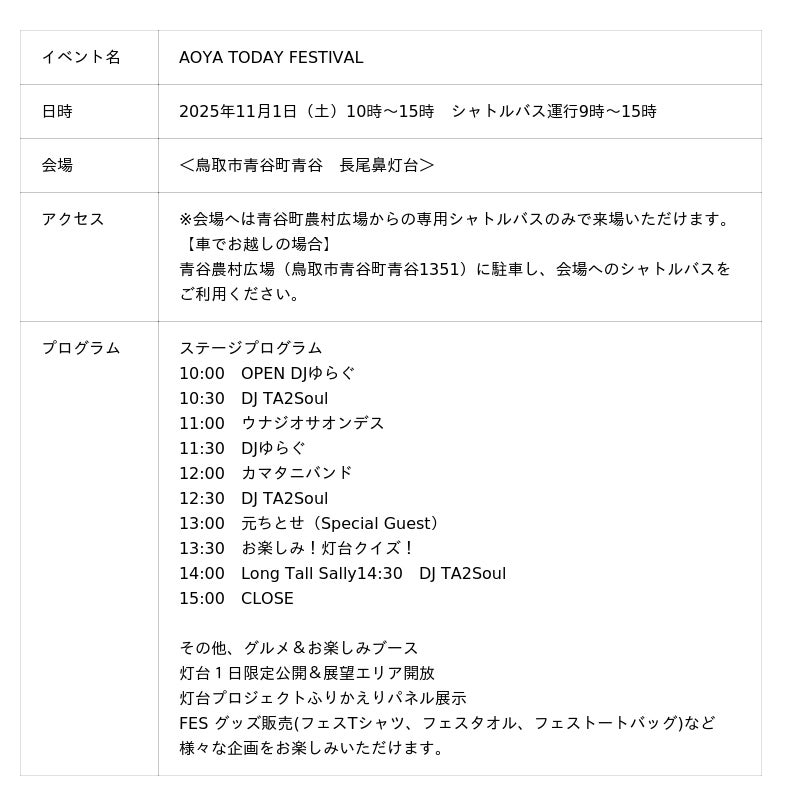 鳥取市青谷地区振興プロジェクト実行委員会は、2025年11月1日にAOYA TODAY FESTIVALを開催いたします。このイベントは、日本財団「海と日本プロジェクト」の一環として、灯台を中心に地域の海の記憶を掘り起こし、地域と地域、異分野と異業種、日本と世界をつなぎ、新たな海洋体験を創造していく「海と灯台プロジェクト」の助成を受けて実施します。