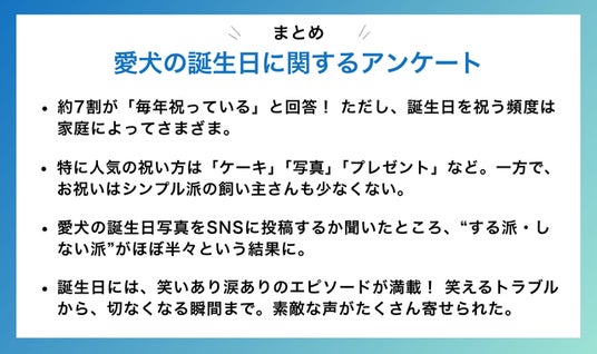 - 愛犬の誕生日写真をSNSに投稿するか聞いたところ、“する派・しない派”がほぼ半々という結果に。