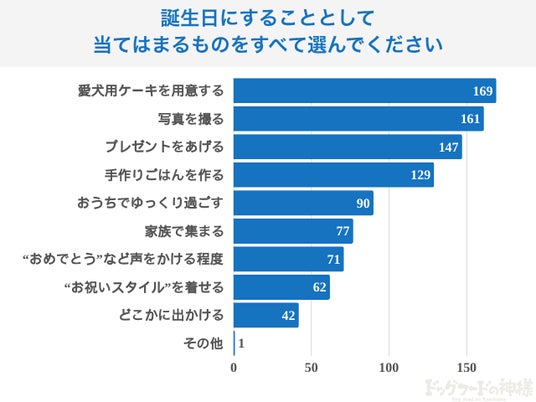 愛犬の誕生日には「ケーキを用意する」「写真を撮る」など、特別な一日を演出する飼い主さんが多数派という結果に。プレゼントや手作りごはんを用意する声も目立ちました。