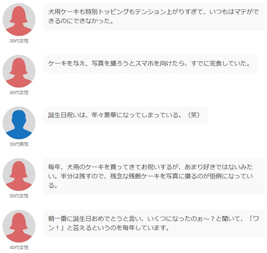 そのほか、「いくつになったの?」の問いかけに毎年“ワン!”と返事をさせる恒例行事や、半分残されたケーキを記念撮影するご家庭もあり、それぞれの「わが家らしいお祝い」が垣間見えました。