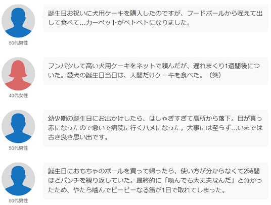一方で、「祝ったことがない」(10%)や「誕生日が不明」(4%)といった声もありました。保護犬などで正確な誕生日が分からないケースや、そもそも祝う習慣がない家庭も見られます。