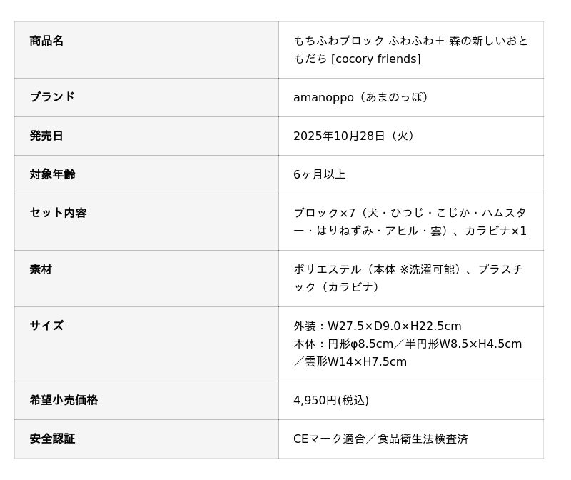 株式会社TowaStela(本社:東京都豊島区、代表取締役:丸谷陽介)が展開する日本生まれのベビーブランド〈amanoppo(あまのっぽ)〉は、2025年10月28日(火)に新商品『もちふわブロック ふわふわ+ 森の新しいおともだち [cocory friends]』を発売します。