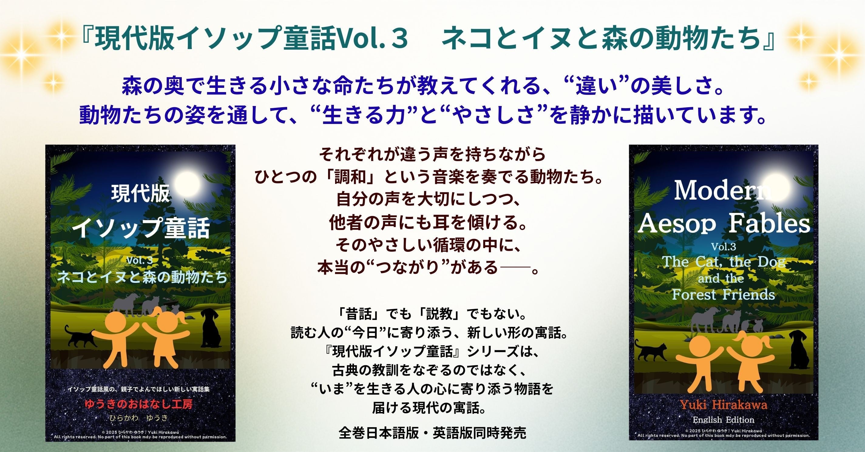 新シリーズ『現代版イソップ童話Vol.3 ネコとイヌと森の動物たち』-感じる心を描く“静かな寓話” 日本語版・英語版同時発売